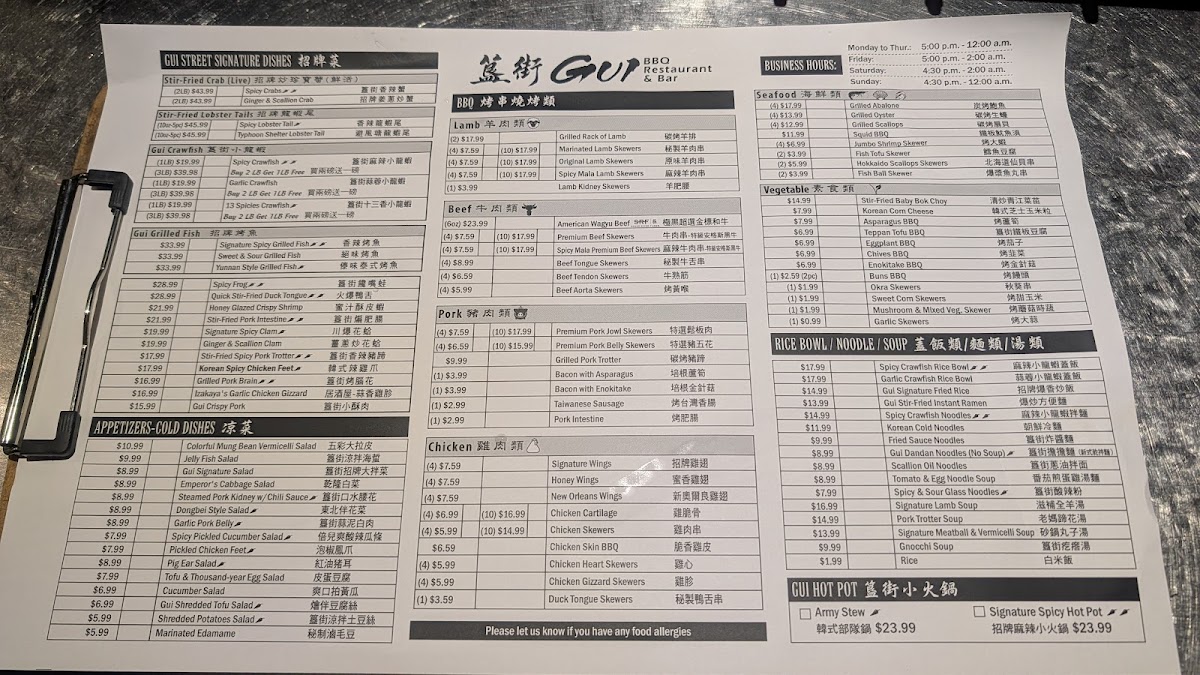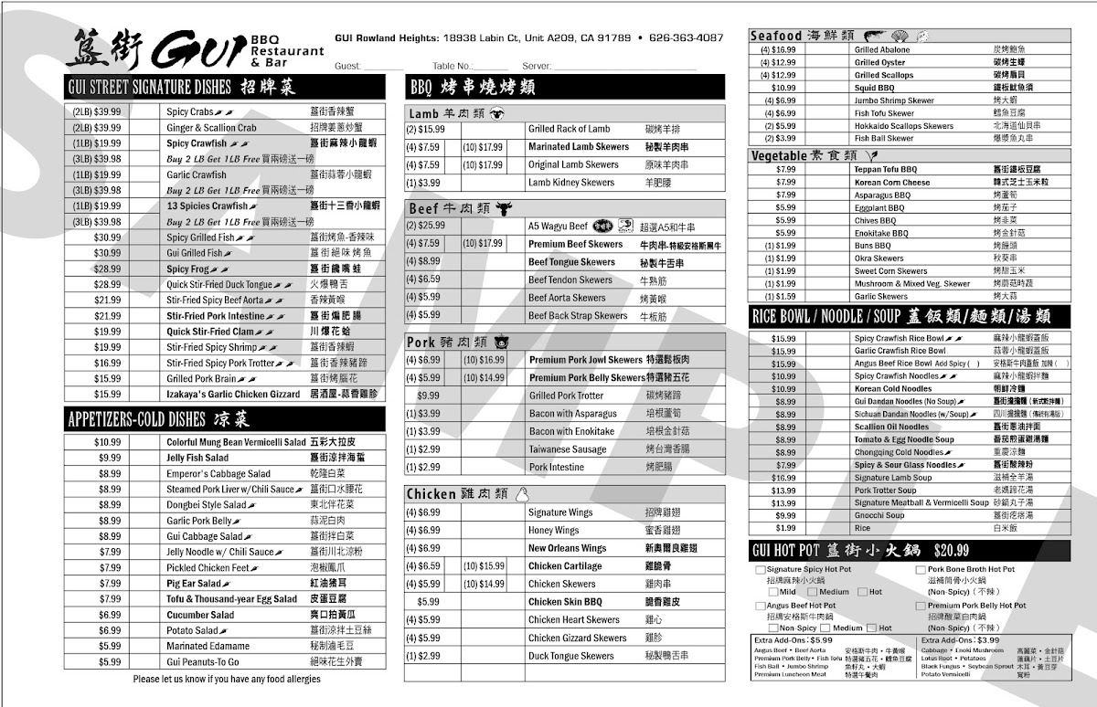 At Gui BBQ Restaurant & Bar, you'll find a menu that brings together bold flavors and rich traditions, offering the perfect balance of smoky BBQ and savory sides. Every dish is thoughtfully crafted with quality ingredients, from sizzling grilled meats to hearty, flavorful sides that complement each bite. Whether you're craving a juicy cut of meat, a vibrant salad, or something sweet to round off your meal, the offerings cater to all tastes and preferences. With each dish prepared to order, you can be sure you're getting the freshest ingredients that deliver on taste and satisfaction. The vibrant atmosphere makes it the perfect spot for friends and family to gather over a delicious, satisfying meal. Whether you're a BBQ aficionado or new to the experience, the Gui BBQ Restaurant & Bar Menu promises to serve something you'll enjoy.